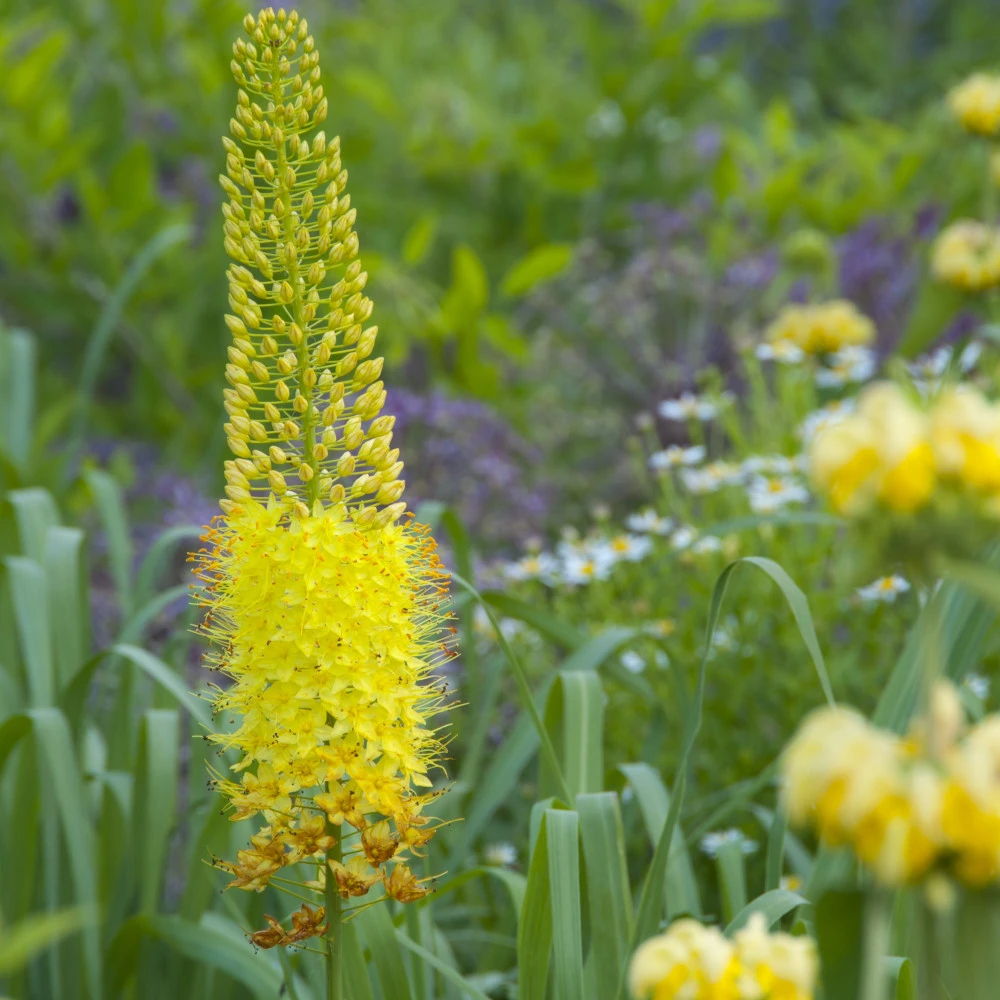 Pustynnik Bungei (Eremurus) to okazała bylina o efektownych, intensywnie żółtych kwiatach zebranych w wysokie, smukłe kwiatostany. Osiąga wysokość 100–120 cm, wprowadzając do ogrodu egzotyczny akcent i elegancję. Dzięki zwartej formie i oryginalnej kolorystyce, doskonale sprawdza się w nasadzeniach soliterowych oraz jako tło dla niższych bylin i traw ozdobnych. Najlepszy efekt dekoracyjny uzyskuje się, sadząc pustynniki w grupach po kilka sztuk.
